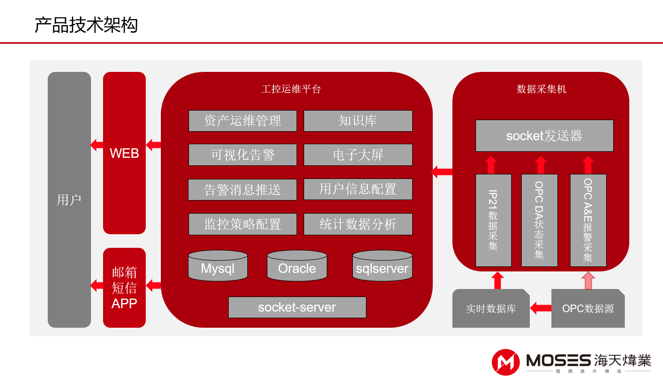Moses工控运维管理平台是基于WEB界面提供分布式数据采集以及集中化在线检测管理功能的企业级解决方案。通过采集(DCS/SIS/GDS/PLC)等工控系统、设备以及仪控仪表等数据,汇总到智能监控中心,利用自主研发的“告警策略类库”核心模块,对数据进行异常分析处理并产生报警,实现核心仪控设备预测性维护。海天炜业Moses工控运维管理平台主要包括驾驶舱、可视化监控、告警处理、知识库、资产运维管理、统计概览分析、监控策略配置八大主要功能模块。